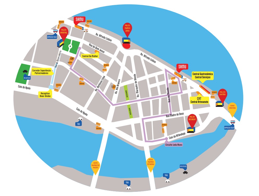Os novos locais são próximos à Ponte Giratória, já liberada à circulação, para garantir mais conforto e facilitar a mobilidade. Outras grandes novidades são o Polo Samba, que sai da Rua da Moeda e passa para o local mais conhecido como Parador, e o corredor de alimentação, com mais de 30 barracas, situado na Rua Domingos José Martins.