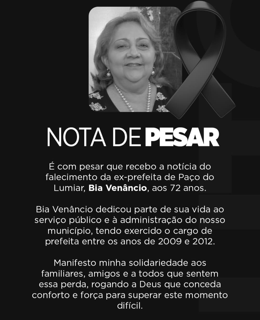 A ex-prefeita de , Glorismar Rosa Venâncio, conhecida como Bia Venâncio, faleceu nesta segunda-feira (2), aos 72 anos. A confirmação da foi feita no início da noite.