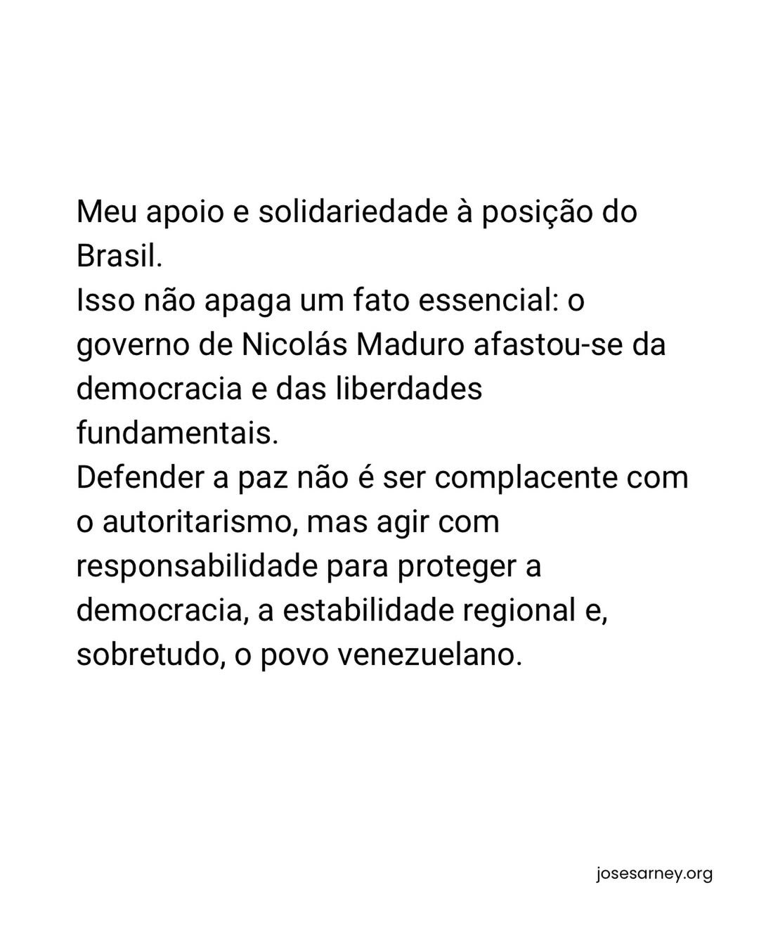 Em sua manifestação, Sarney demonstrou apoio à posição diplomática adotada pelo Brasil, mas fez questão de ressaltar que isso não significa conivência com práticas autoritárias. Para o ex-presidente, o governo de Nicolás Maduro se afastou dos princípios democráticos e das liberdades fundamentais.