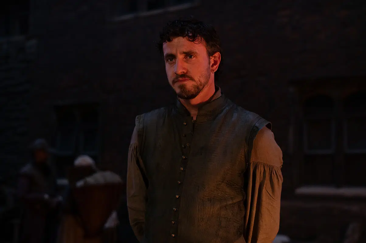 Por outro lado, Paul Mescal enfim consegue trabalhar uma atuação digna da expectativa que sua própria carreira criou ao seu redor nos últimos anos. Ele encanta com a inocência de um apaixonado, numa época em que os homens precisavam ser brutos para terem serventia. Sua relação com as famílias é complexa e isso só funciona porque ele consegue passar com maestria essa sensação de estar perdido na vida. Sem rumo, ele se apega aos próprios sentimentos para encontrar a subsistência, mas até mesmo isso passa a atormentá-lo. Em meio aos bloqueios criativos oriundos das dificuldades que enfrenta, ele questiona sua própria existência e serventia, mesmo já sendo um pai de família. E por conta dessa amargura, ele digere seu papel e encontra na dramaturgia uma forma de fazer as pazes com a esposa, com a família, com o filho morto e, por fim, com seu âmago.