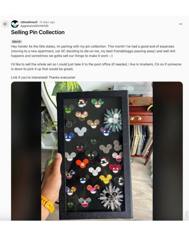 Através do Reddit, um dos admiradores do produtor e DJ canadense publicou uma imagem de sua coleção de pins temáticos de Deadmau5, anunciando sua venda. Segundo o usuário, a intenção com o dinheiro era pagar as contas após um mês complicado financeiramente.