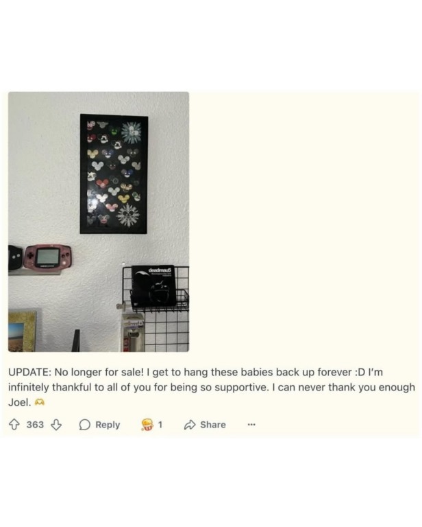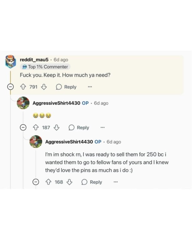 Prontamente, o fã retornou dizendo que estava planejando vender os pins por U$ 250, e que sua intenção era repassá-los para alguém que gostasse do trabalho de Deadmau5 tanto quanto ele. Encerrando o tópico no Reddit, o usuário publicou uma atualização dizendo que ficaria com a coleção, e acrescentou: