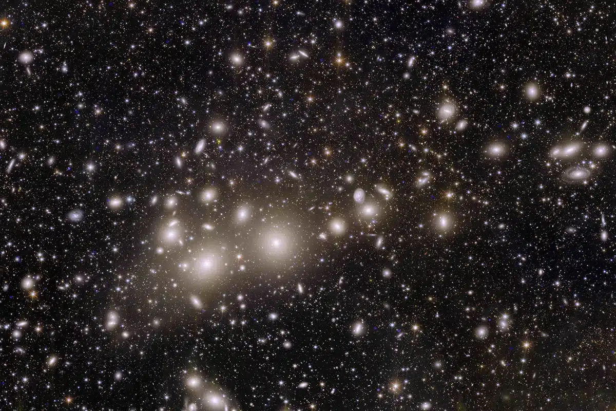 As galáxias tendem a se aglomerar, como no Aglomerado de Perseu, com grandes vazios entre elas. Mas, em grandes escalas, tudo deve se equilibrar. – Crédito: ESA/Euclid/Euclid Consortium/NASA, processamento de imagem por J.-C. Cuillandre (CEA Paris-Saclay), G. Anselmi
